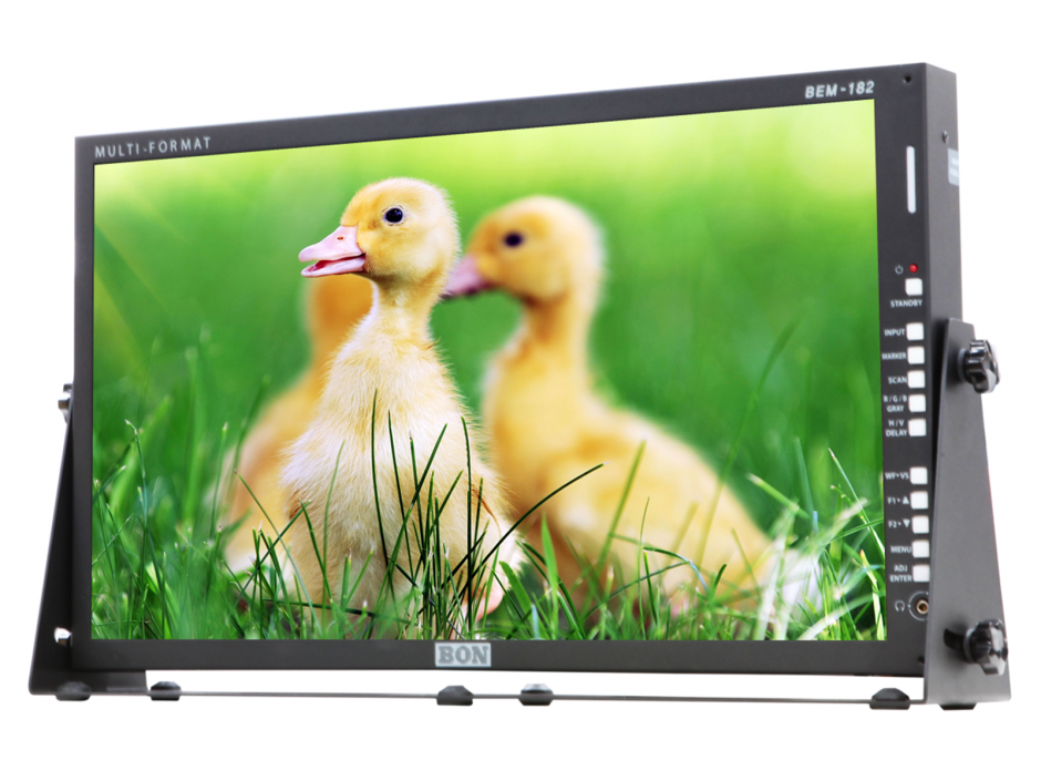 BEM-182 is a cost-effective 18.5″ LED broadcast monitor. It has color-calibrated screen with selectable color temperatures. It can be attached in front of a rack providing larger viewable area than general 17″ rack/wall mount monitor. A V-Mount or Anton Bauer battery is attachable on the back and an optional tilting stand is selectable on purchase.